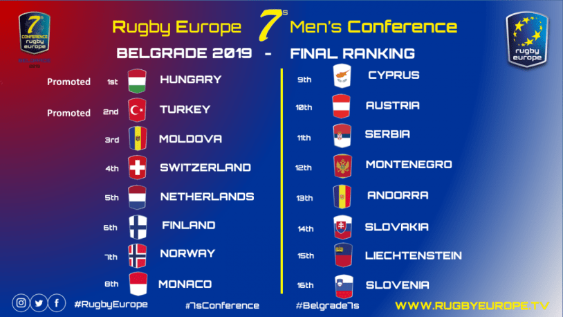 After 2 days of competition played under very hot conditions (30 degrees), Hungary win the Men’s Sevens Conference 2019 in Belgrade.